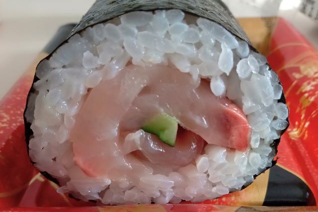こちらはおうちにあったわさびと醤油をつけていただきました。まあ普通に美味しかったけれども、ちょっと物足りなさを感じました。これなら太巻にせずとも、ぶりの海鮮丼にして食べた方がいいかなと思いました。